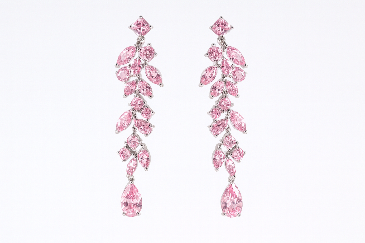 透明感あふれるピンクサファイアを贅沢に使用した、華やかでフェミニンなドロップピアス。
