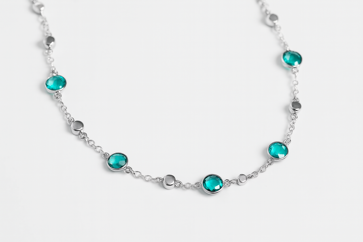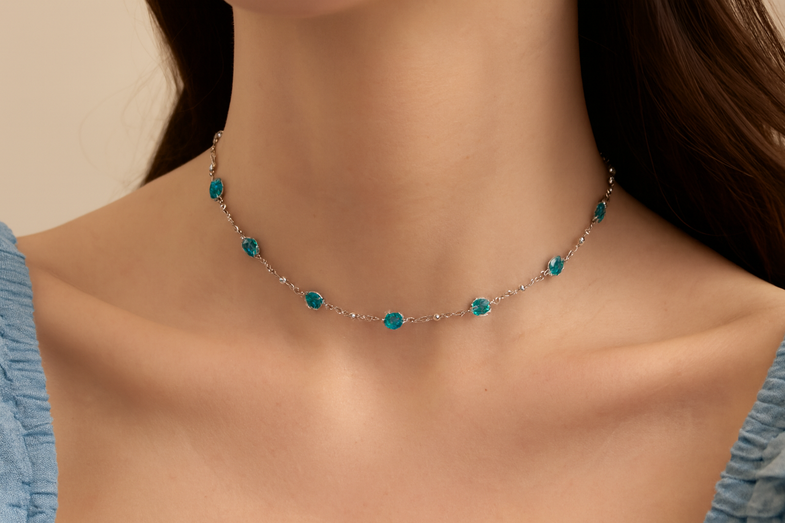 澄んだ海のように輝くアクアマリンを、等間隔にセッティングしたプラチナステーションネックレス。