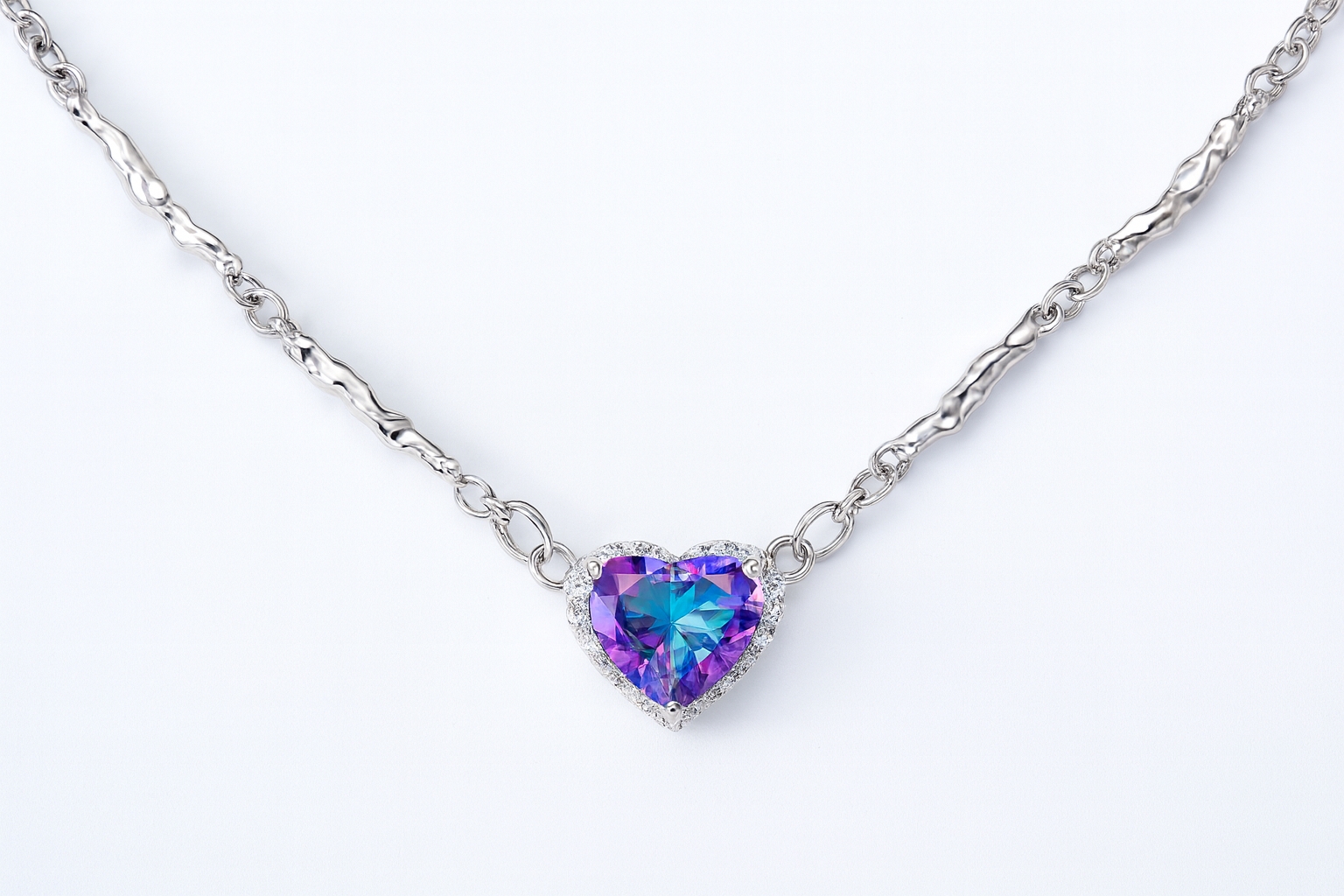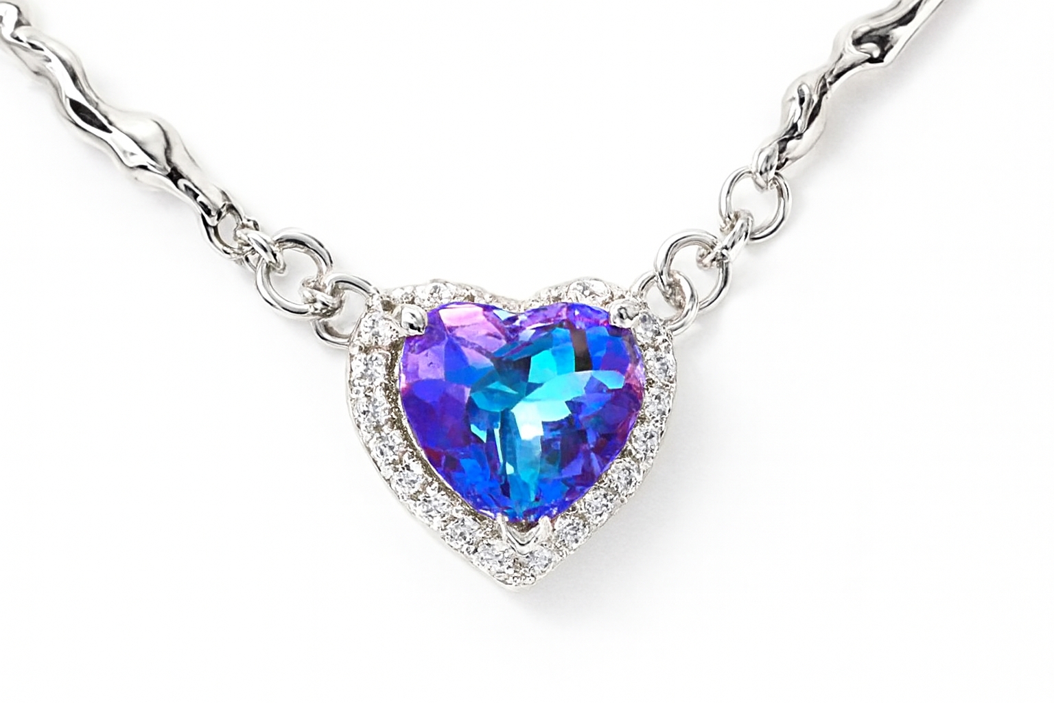 角度によってブルーからパープルへと幻想的に色を変える、ミスティックトパーズをセッティングしたプラチナハートネックレス。