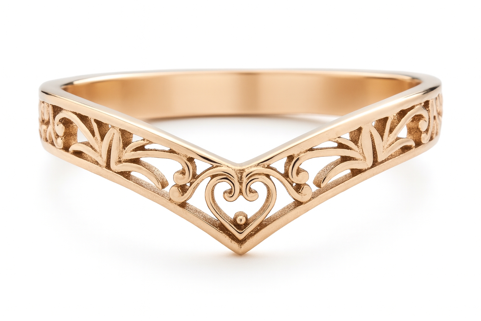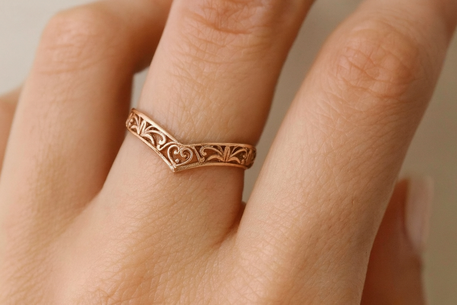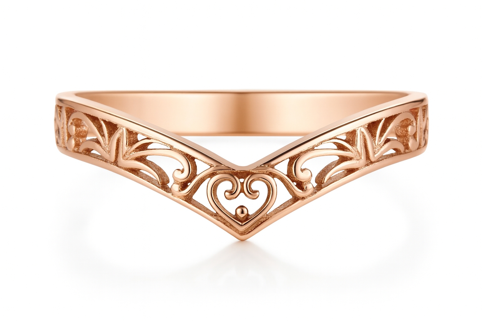 アラベスク模様が美しく流れるVラインリング。ハートを忍ばせた上品でロマンティックなデザイン。