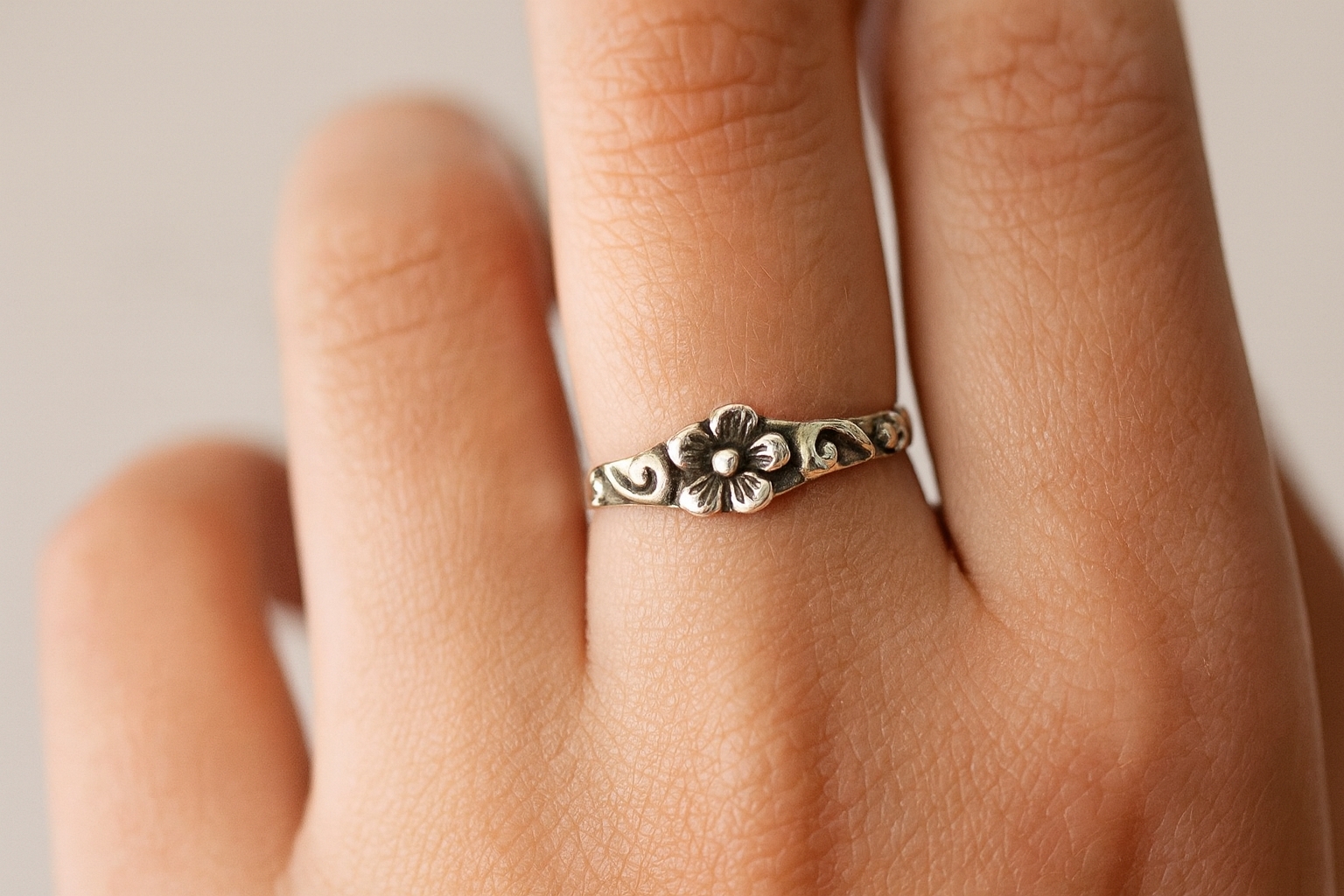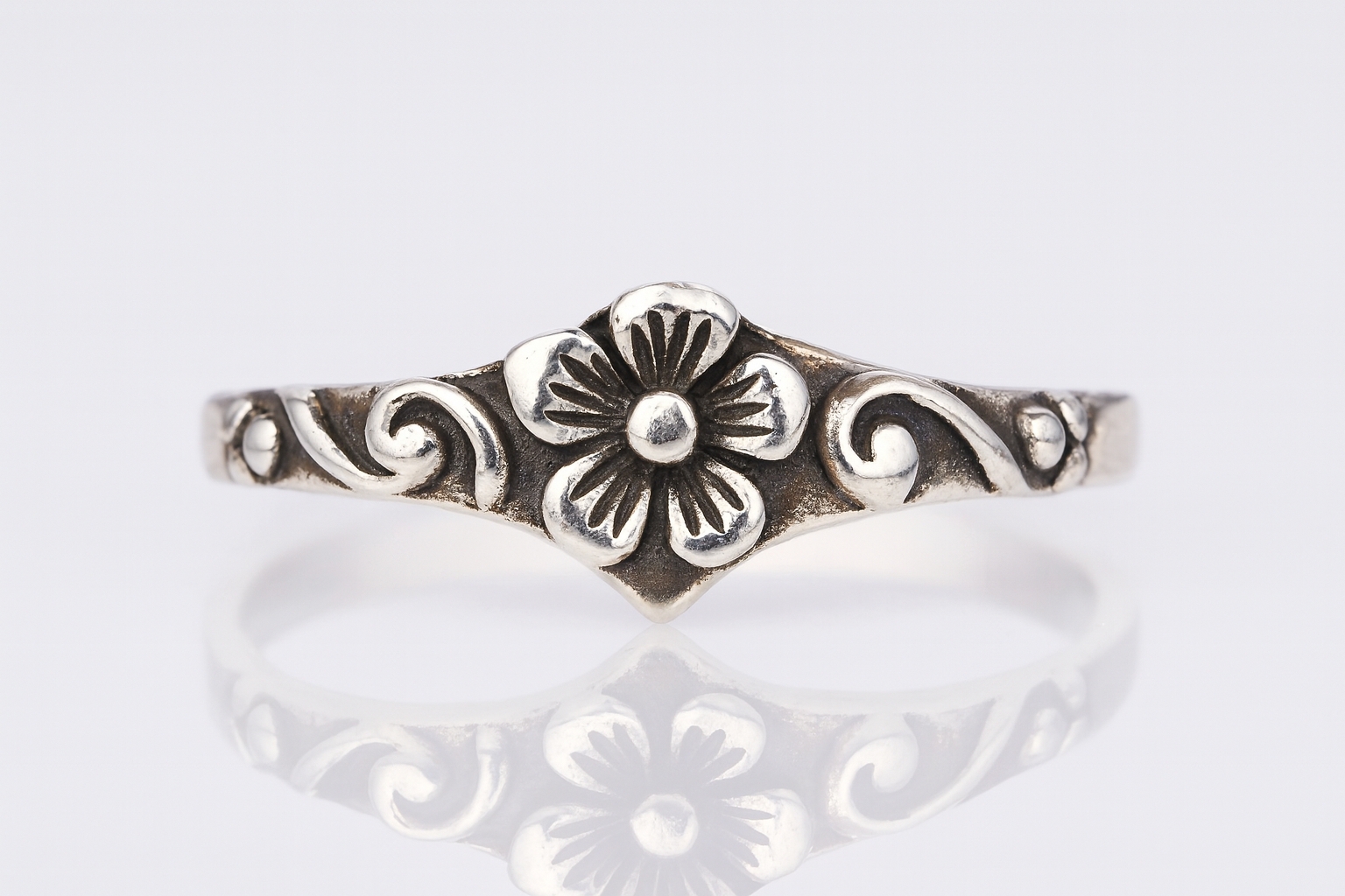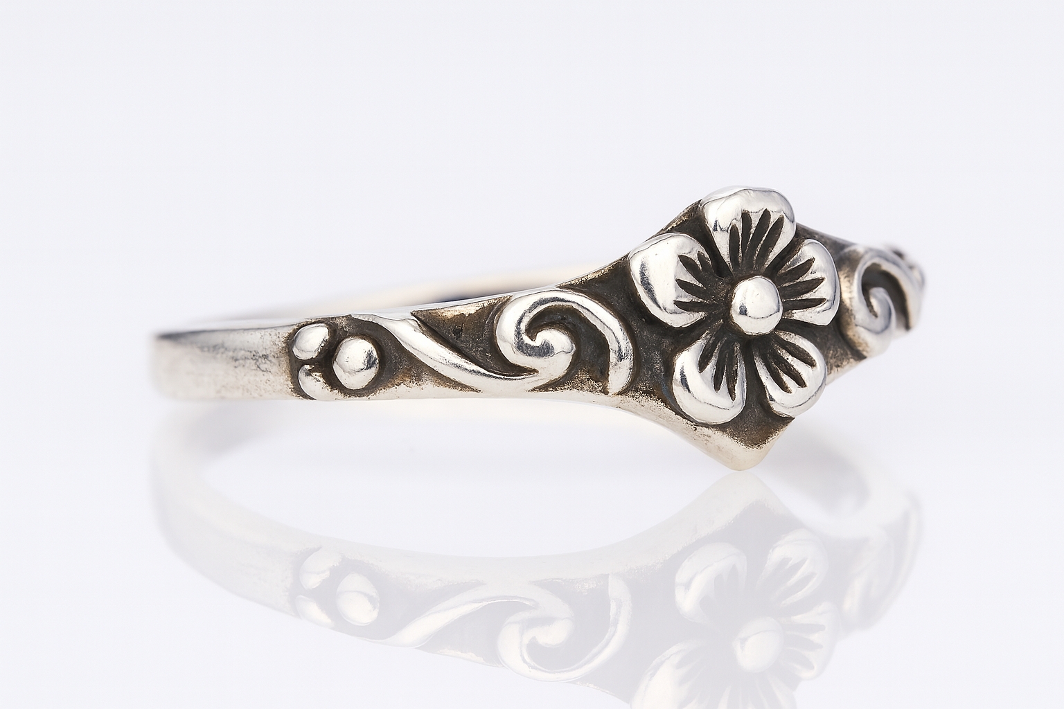 クラシカルな唐草模様と花のモチーフが調和した、繊細なデザインのシルバーリング。
